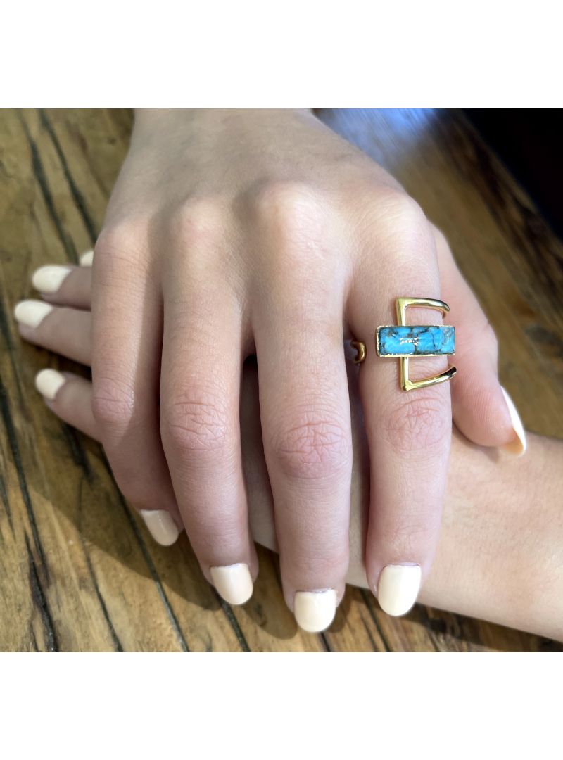 Bague de couleur dorée ouverte et réglable, sertie d’une pierre en Apatite bleue.